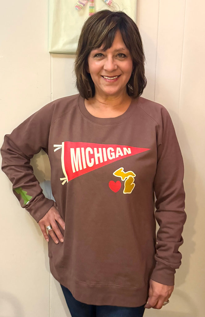 A Michigan Mittens Original. Bold and full of State Pride. Our NEW Michigan Pennant design on this super cute and oh-so-cozy Ladies Crew Pullover is sure to be your new FAVORITE. Perfect for those cool Spring days or Summer/Fall nights around the campfire. Rustic luxury!