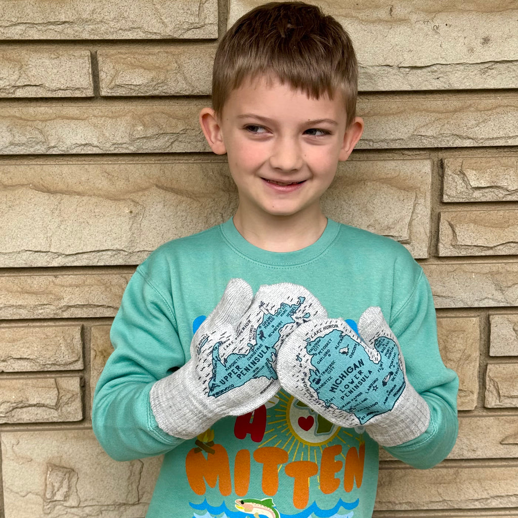 A mini version of our Original Michigan Mittens in Fog Grey. So cute! Fits approximately ages 7-12+ years old. Always have a "map" on hand with our NEW Youth Michigan Mittens!